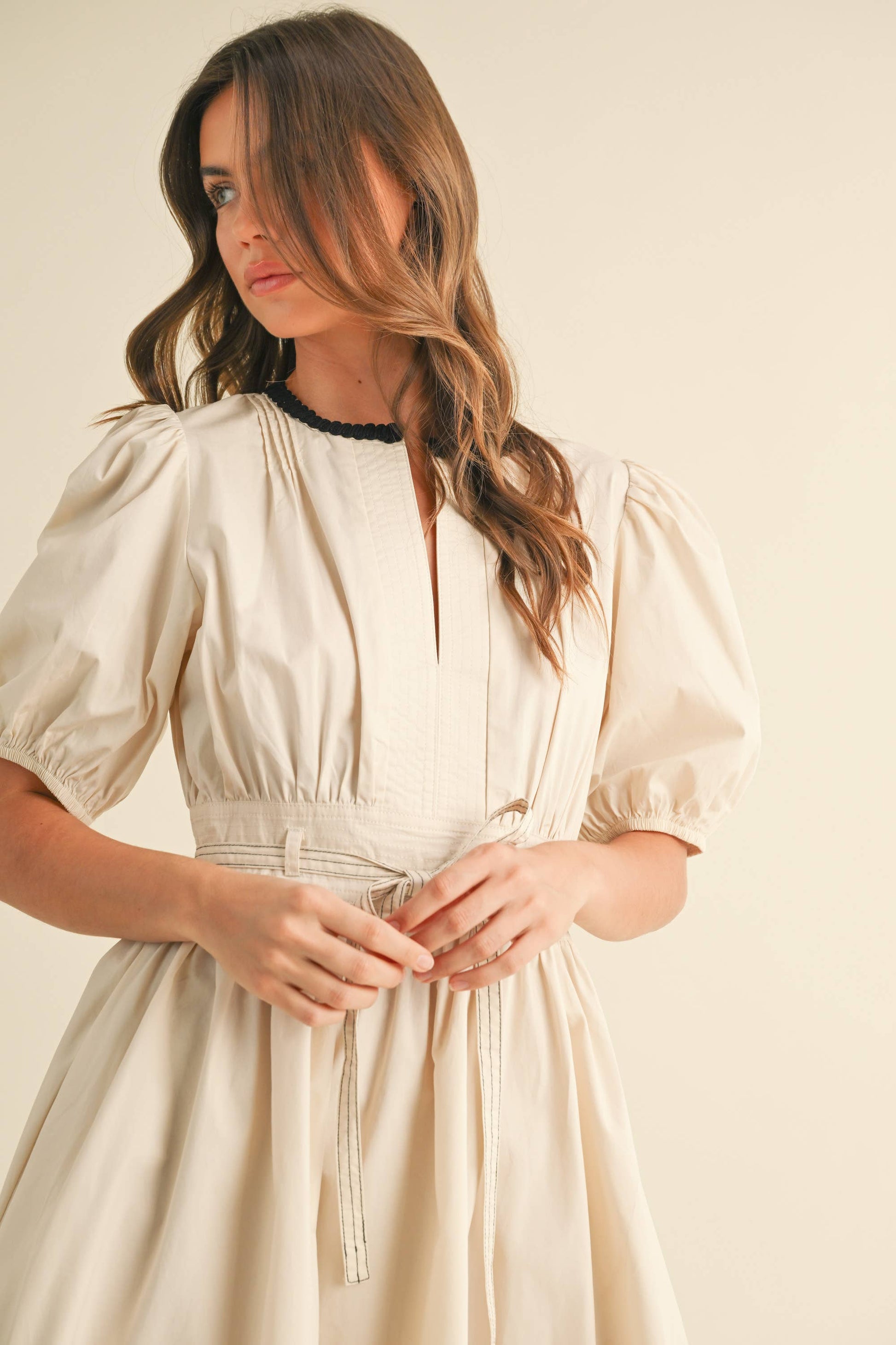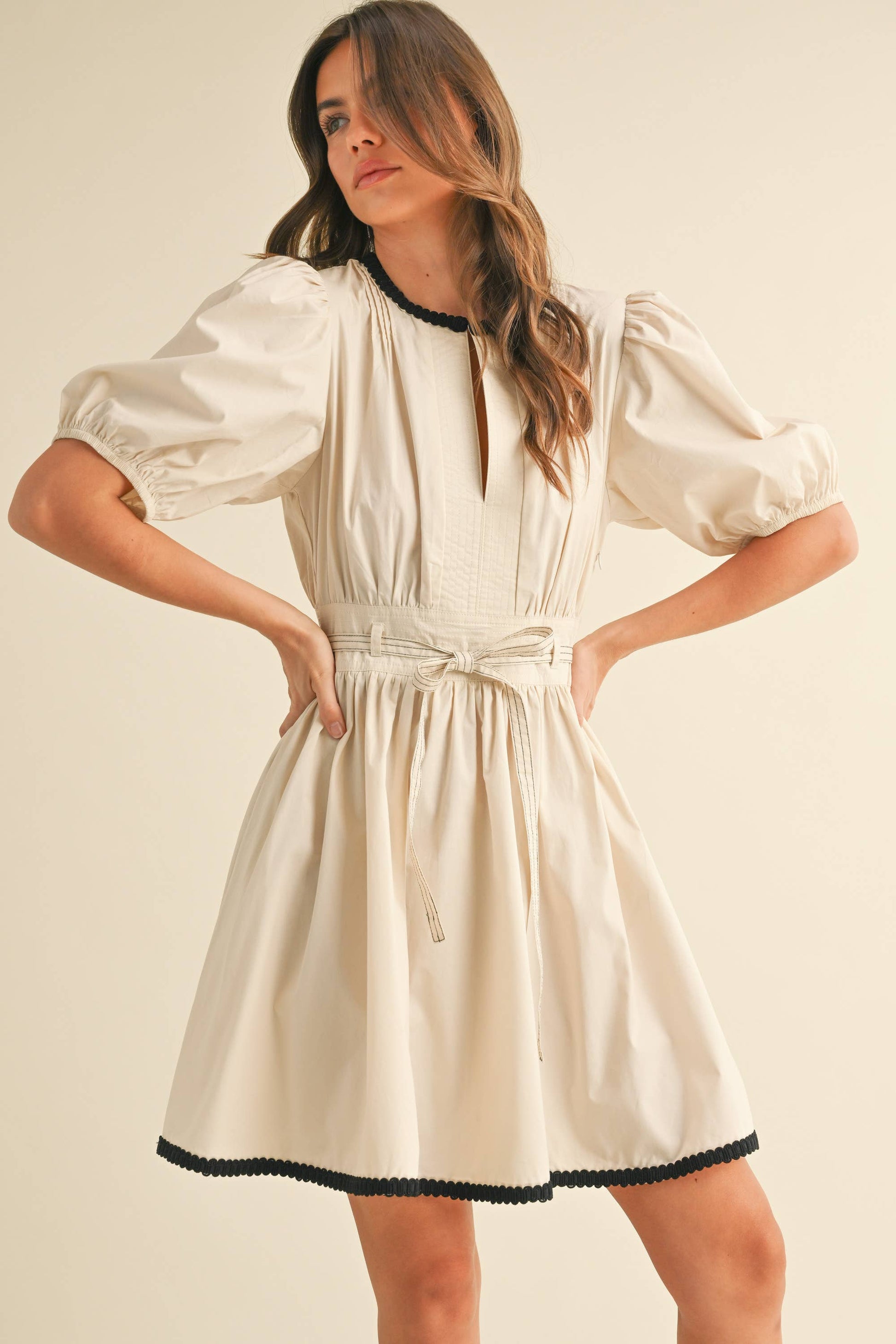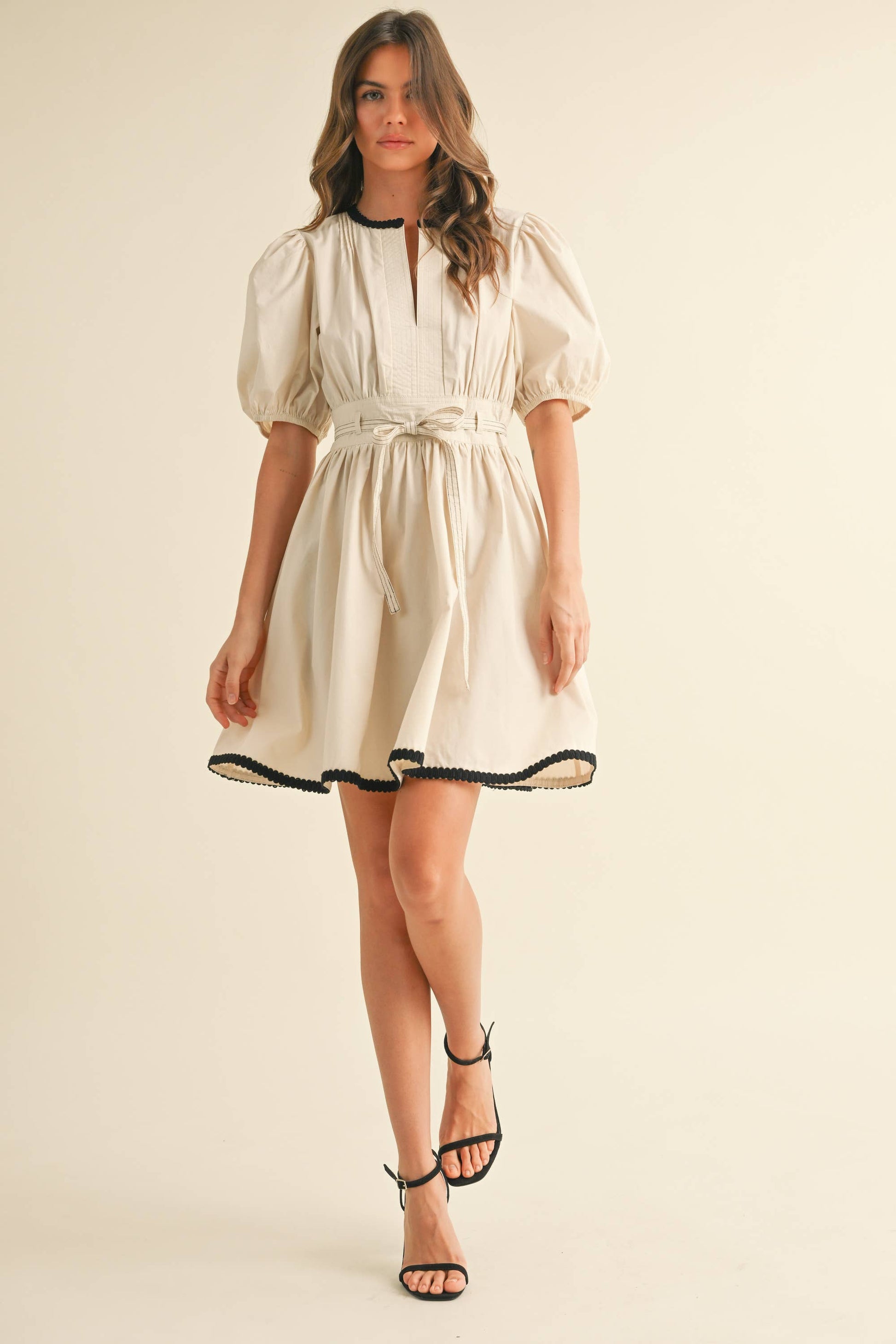 BELTED PUFF SHORT SLEEVE A-LINE FLARED MINI DRESS